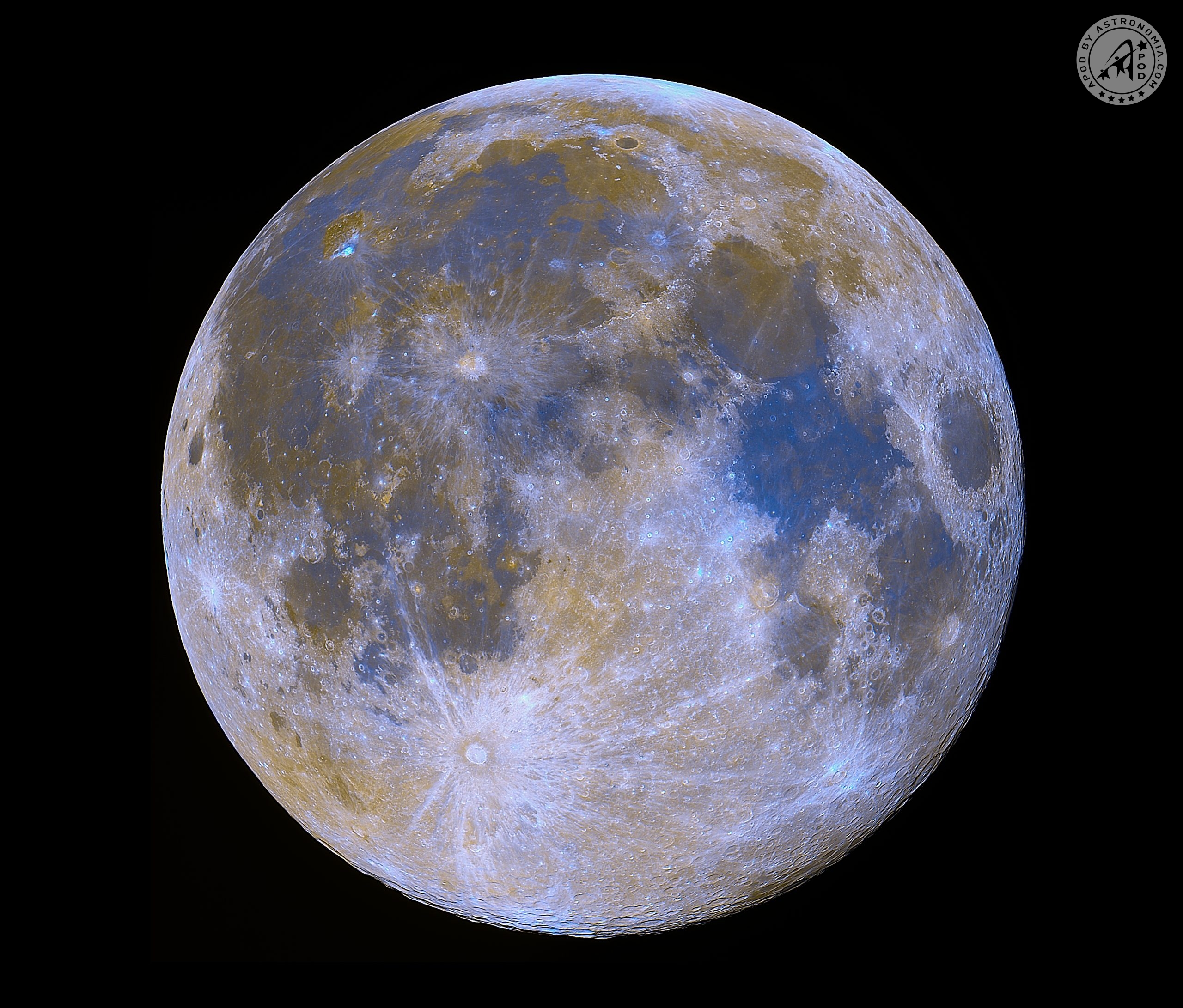 Questo mosaico, composto da 17 immagini, mostra la Luna piena del Castoro, la più vicina e luminosa del 2025, perciò chiamata anche “superluna”. La prossima si verificherà a dicembre e sarà anche l’ultima di quest’anno. Ho aumentato la saturazione dei colori per mostrare le differenze di composizione chimica della regolite lunare nelle varie zone della superficie.