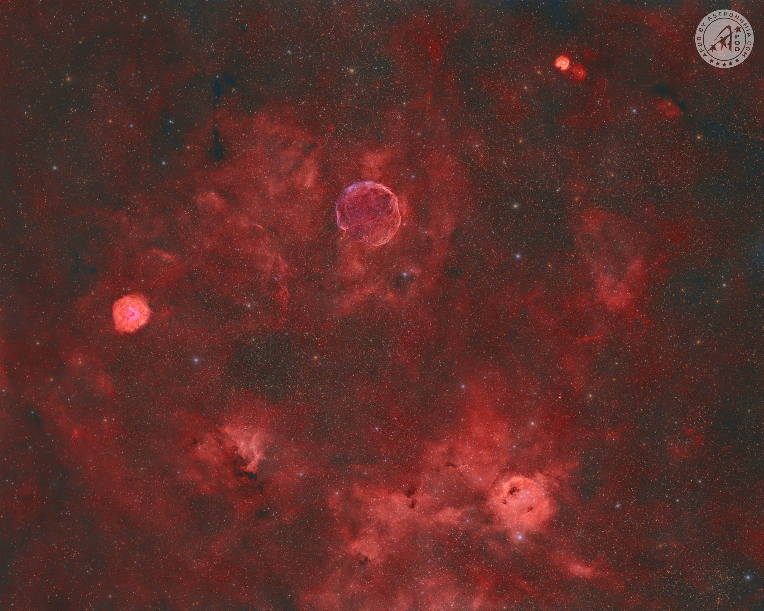 Al centro, CTB1, conosciuta anche come Nebulosa testa d’Aglio (Garlic Nebula) per via della sua forma, è un residuo di supernova situato nelle vicinanze del sistema solare. Inizialmente si pensava che CTB1 fosse una nebulosa planetaria tanto che Abell la incluse nel suo catalogo di nebulose planetarie come Abell 85. Situata nella costellazione di Cassiopea, è un oggetto molto stimolante ma anche evanescente e abbastanza ostico da fotografare.