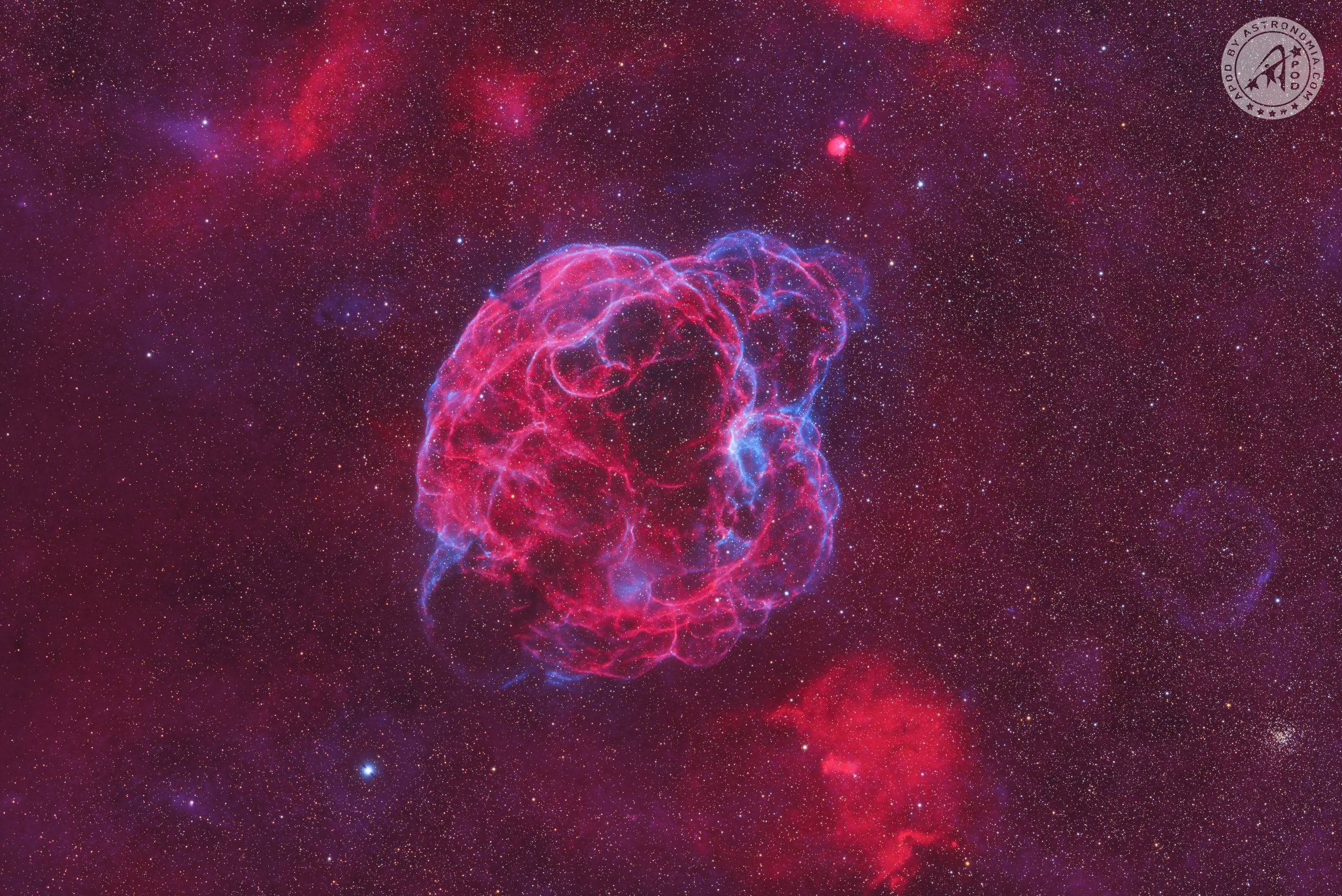 Questa complessa rete di filamenti rossi e azzurri appartiene a Sh2-240, la cosiddetta Nebulosa Spaghetti, uno dei più vasti e deboli resti di supernova osservabili nel cielo. Situata a circa 2.000 anni luce nella costellazione del Toro, si estende per oltre 150 anni-luce: un’enorme shockwave stellare che continua ad allargarsi da quasi 20.000 anni, quando una stella massiccia concluse la sua vita con una violenta esplosione.
