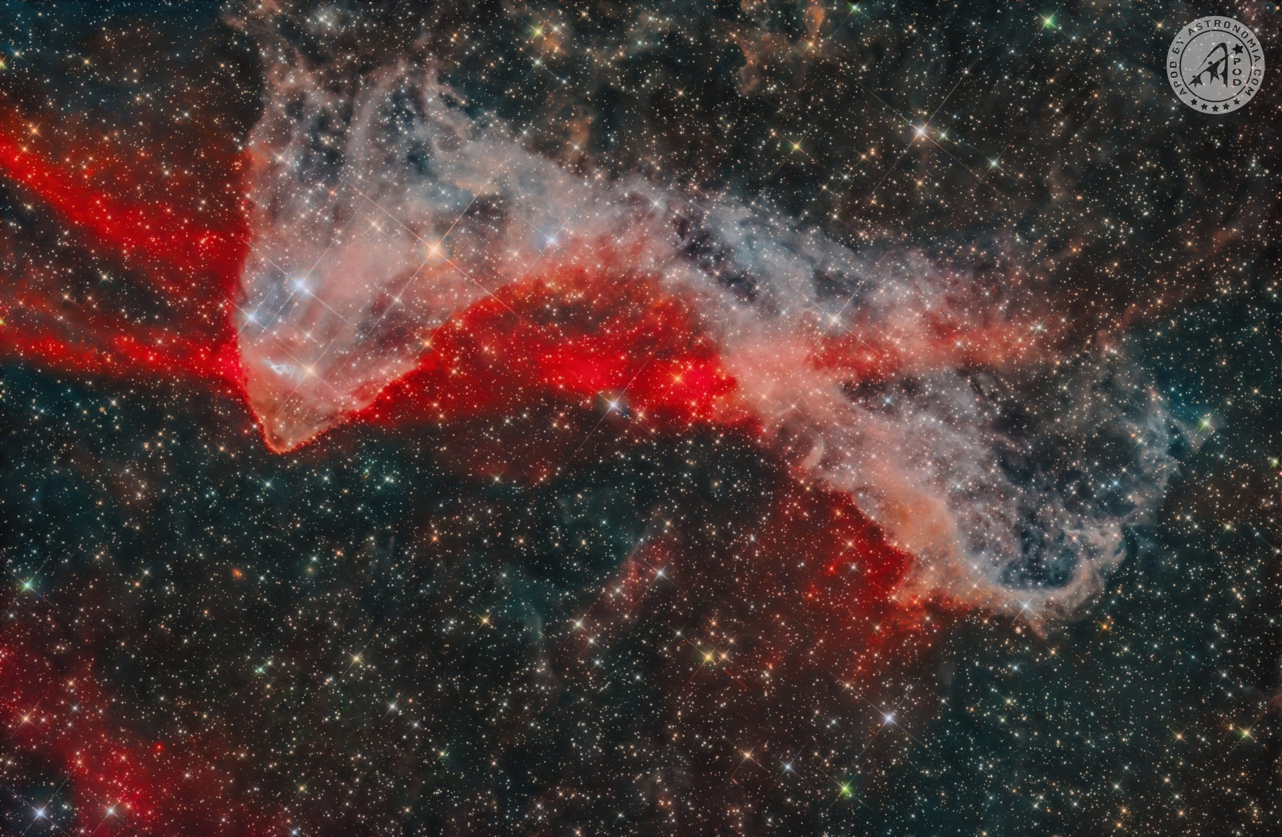 La nebulosa del geco (LBN 437) è una nebulosa diffusa composta da gas ionizzati e polveri interstellari. La sua luminosità deriva dalla radiazione ultravioletta di stelle giovani, che eccita il gas producendo emissioni colorate. La forma irregolare, modellata da venti stellari e turbolenze, crea una sagoma che ricorda un geco immerso in un campo stellare.